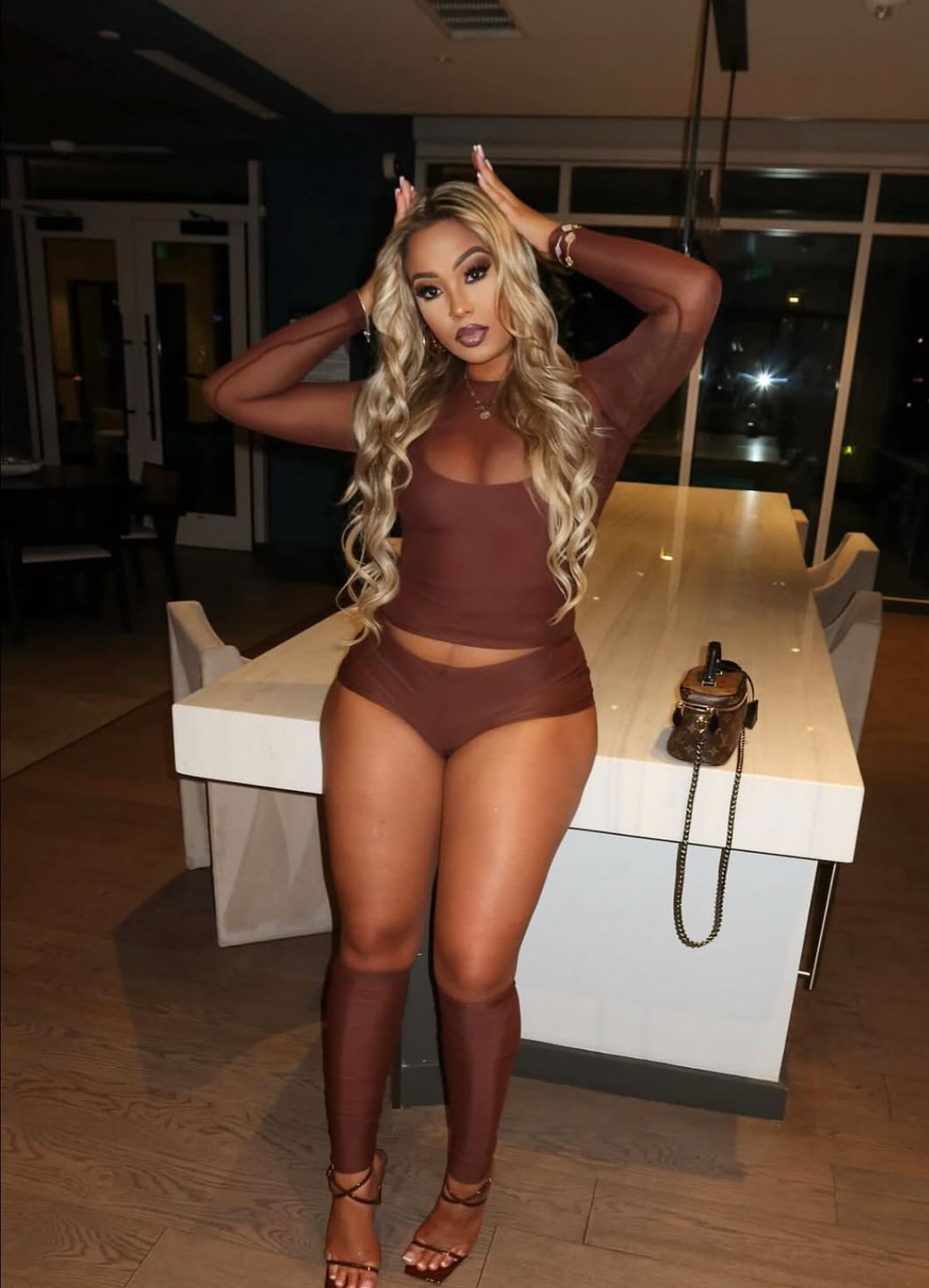 Set include Mesh top, brown tank, matching shorts, and leg warmers.